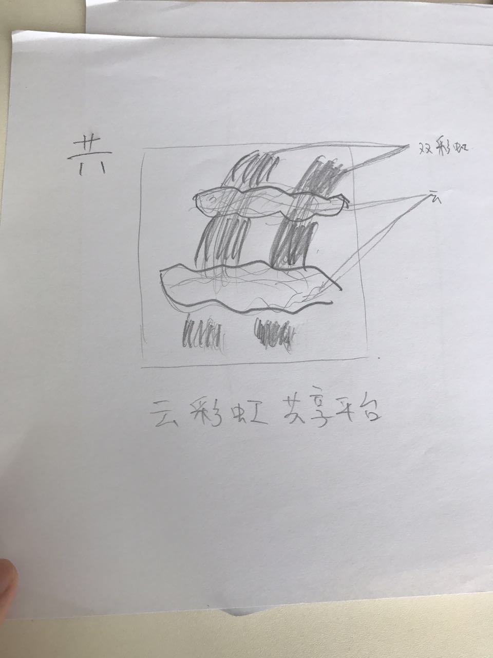主要想要的是作為app的logo,想突出共享這個概念, 其次再考慮云和彩虹,我個人覺得可以做成 “共” 字 兩朵云,一道雙彩虹,如圖: 云的形態(tài)做些適當的修改,但大致要這個樣子