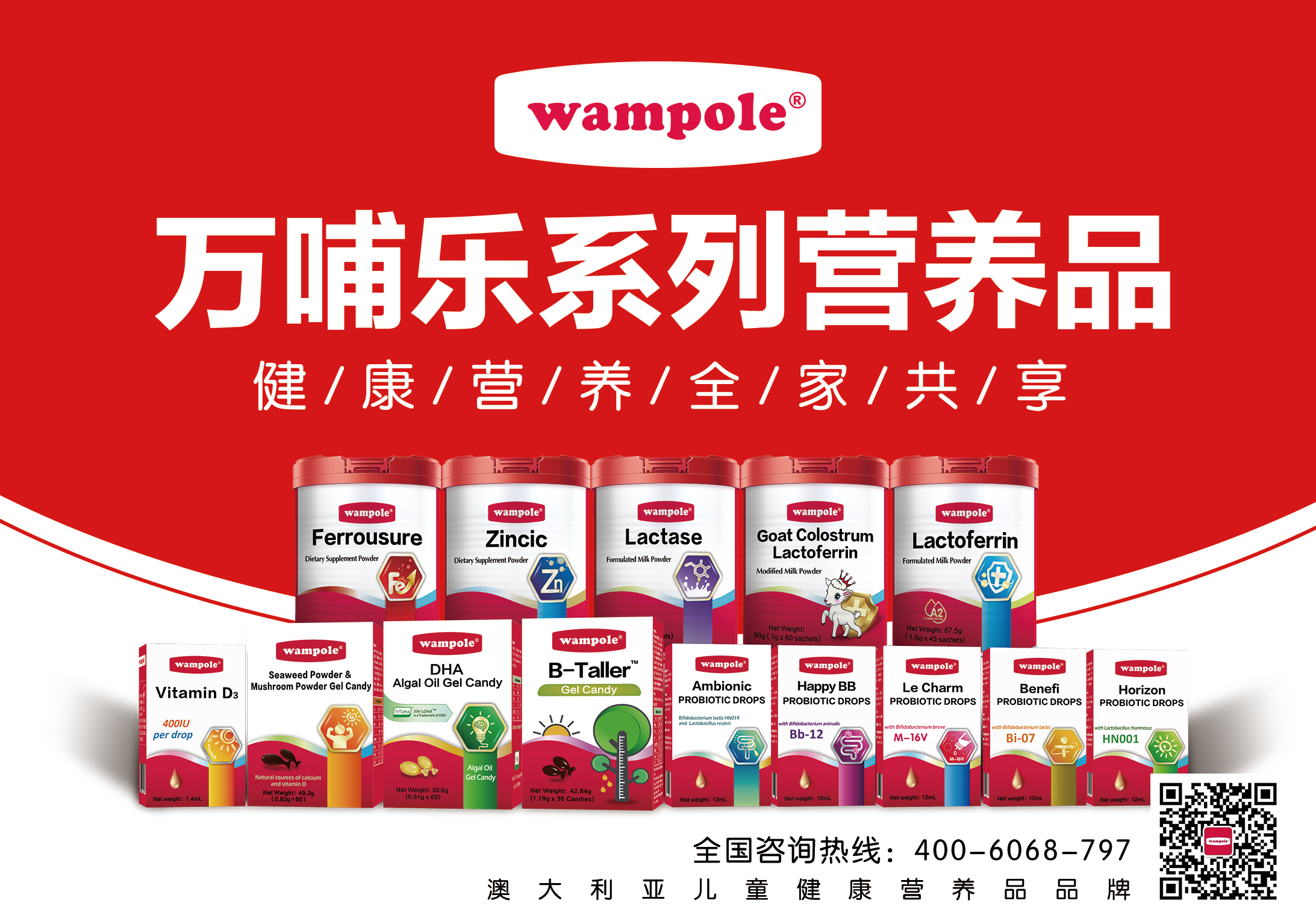 - wampole萬哺樂品牌 進口嬰童營養(yǎng)品系列,匯聚全球優(yōu)質(zhì)資源,采用全球頂級原料,與各品類制藥級世界頂級工廠達成戰(zhàn)略合作,致力于打造中國營養(yǎng)品明星品牌的系列營養(yǎng)品! 專業(yè)專注研發(fā)生產(chǎn)適合嬰幼兒及全家的營養(yǎng)健康產(chǎn)品,產(chǎn)品涵蓋:益生菌滴劑、長高產(chǎn)品、VD鈣、鐵、鋅、牛/羊乳鐵蛋白、藻油DHA、乳糖酶等。 ? 品牌口號:萬哺樂小紅帽 健康營養(yǎng) 全家共享!